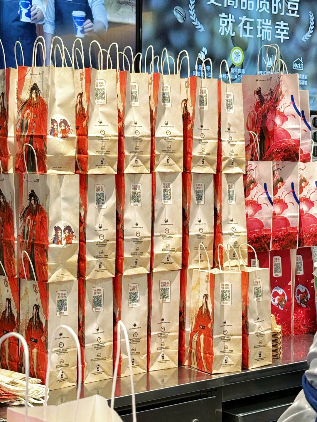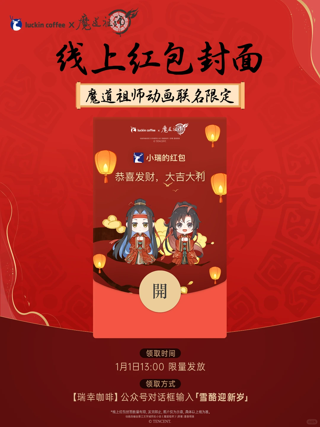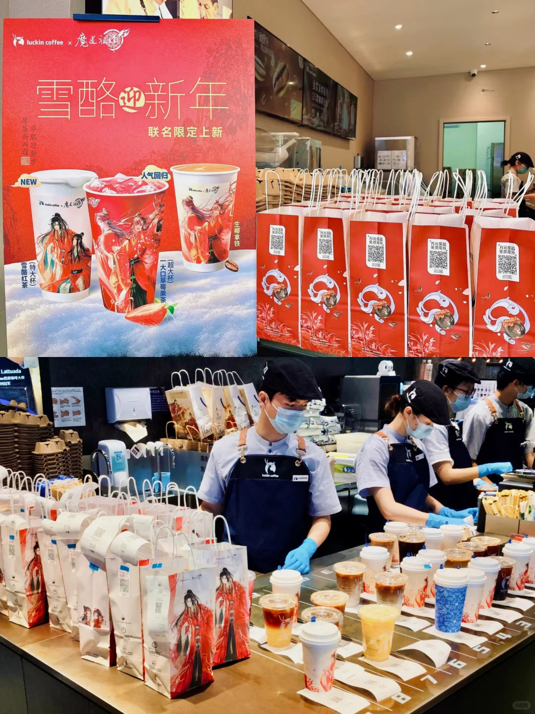 1月5日,瑞幸攜手國(guó)漫IP《魔道祖師》,以“華服迎新歲,琴笛共此程”為主題,正式推出雪酪紅茶、一大口草莓茶兩款非咖新品,并同步首發(fā)三款限定周邊。
