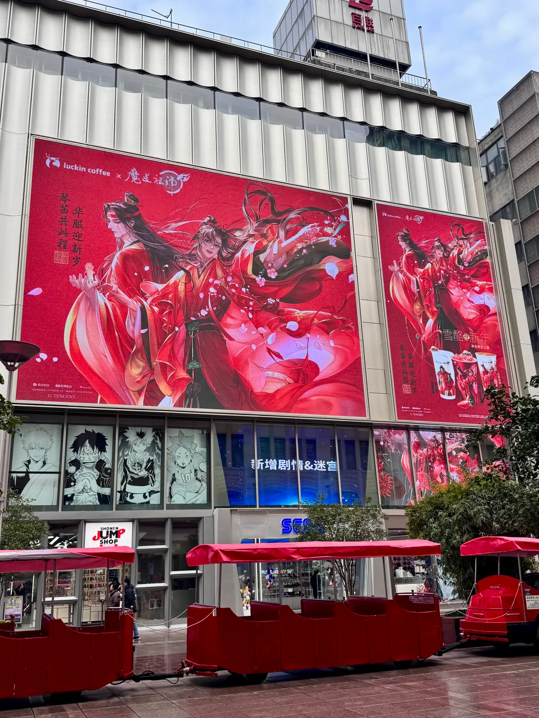為了讓聯(lián)名真正落地,瑞幸不單是“上新品”。在線上,瑞幸把周邊獲取方式、組合路徑整理成攻略,甚至連Q版紅包都一并配齊。在線下,主題門店、蓋章互動(dòng)、大屏廣告同時(shí)上線,把一次IP聯(lián)名,變成了一個(gè)可參與、可打卡的線下事件。