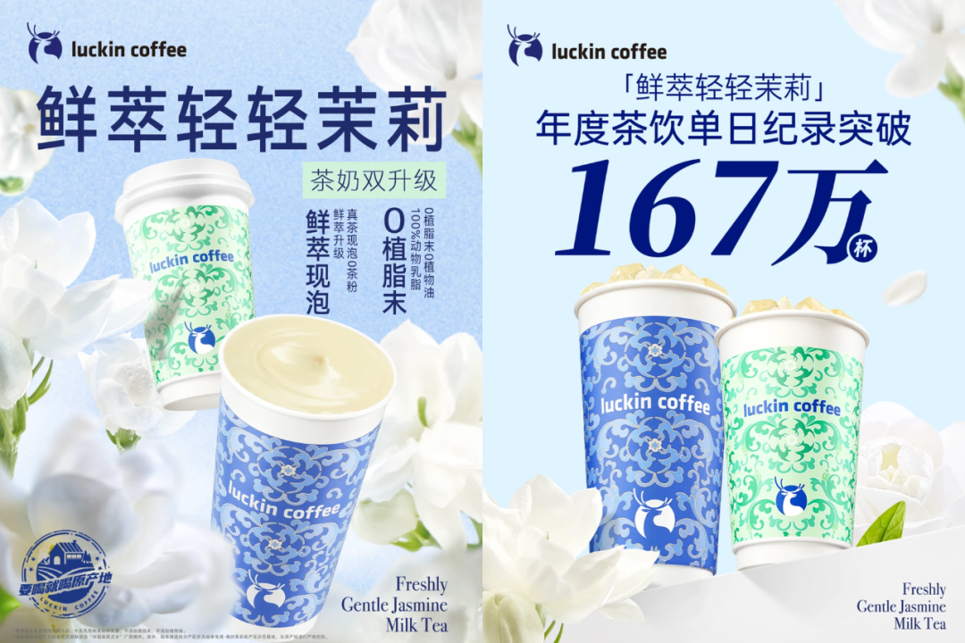 2025年3月,瑞幸升級(jí)推出“鮮萃輕輕茉莉·輕乳茶”,再次啟動(dòng)大規(guī)模9.9活動(dòng),發(fā)放約5億張鮮萃輕乳茶系列兌換券。瑞幸銷售戰(zhàn)報(bào)稱,鮮萃輕輕茉莉單日銷量就突破167萬杯。同年9月,瑞幸推出“9.9元下午茶不限量”活動(dòng),不斷刷新“下午茶”存在感。