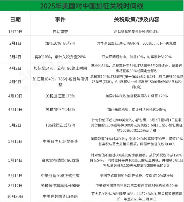 1月,特朗普借“芬太尼問題”對中國商品加征10%關(guān)稅;3月,美國以中國拒絕取消報復(fù)性關(guān)稅為由,對中國征收20%全面關(guān)稅和34%對等關(guān)稅;4月,美國進一步將中國商品關(guān)稅額外提高50%至84%,最終一路提高至145%。