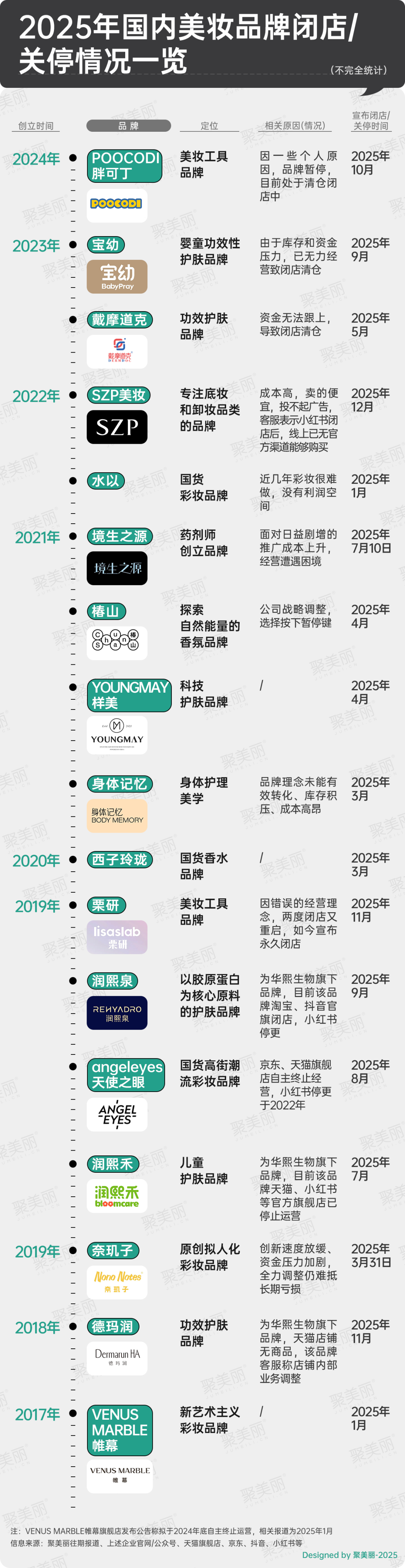 根據(jù)公開資料信息,聚美麗不完全梳理了2025年關(guān)停的國貨美妝品牌境況,發(fā)現(xiàn)已有17個,這些品牌創(chuàng)立時間均在2017-2024年之間,而存活年限最長不超過8年,最短僅1年,大致可分成三類:國內(nèi)頭部美妝集團(tuán)旗下品牌、醫(yī)研共創(chuàng)品牌、中小企業(yè)品牌。