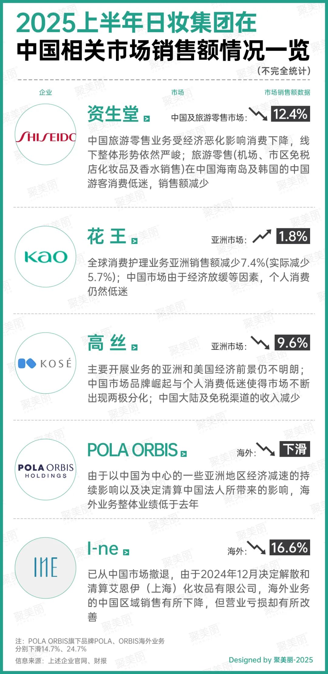 市場數(shù)據(jù)的反饋最為直觀。聚焦日妝在華情況,在2025上半年業(yè)績中,日妝受中國市場增長拖累。資生堂、高絲、POLA ORBIS、I-ne在包括中國在內(nèi)的相關(guān)市場均呈下滑,花王為五大日妝集團(tuán)中唯一一個所有市場全線增長的,但增幅均未超過5%。
