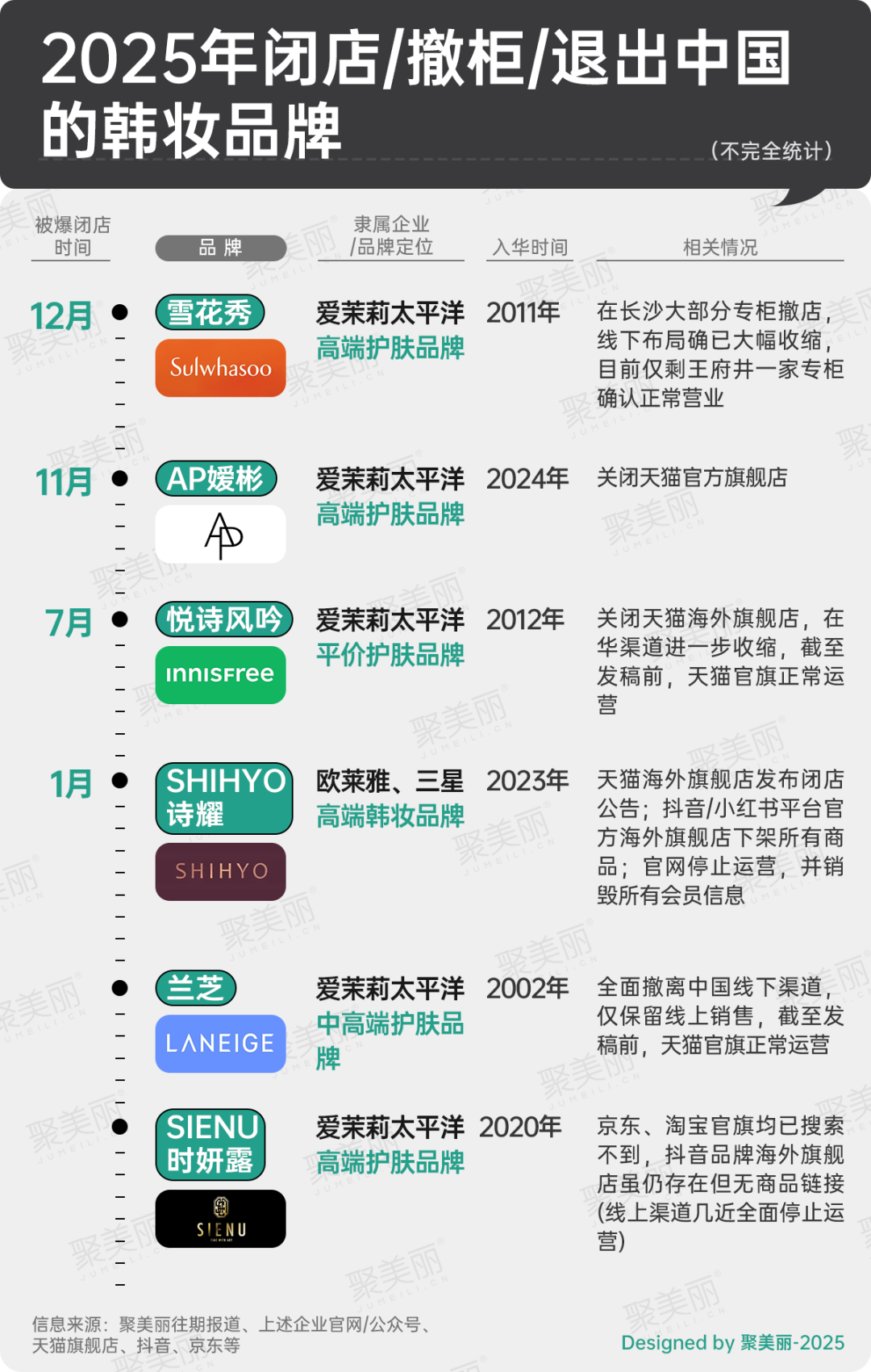 從時間節(jié)點上看,2025年1月韓妝宣布“退出”相關(guān)的最多,有3家,為SIENU時妍露、蘭芝、SHIHYO詩耀;另外2025年末、年中相繼有個別韓妝品牌閉店、撤柜,分別是悅詩風(fēng)吟、AP嬡彬、雪花秀。