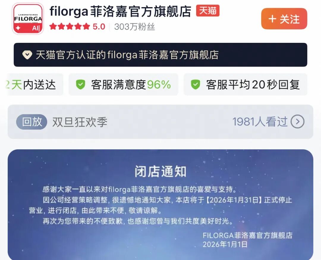 近期,高露潔旗下法國院線護(hù)膚品牌Filorga菲洛嘉在2026年1月1日發(fā)布公告,宣布品牌天貓官旗閉店,表示將于本月底“正式停止?fàn)I業(yè)”。