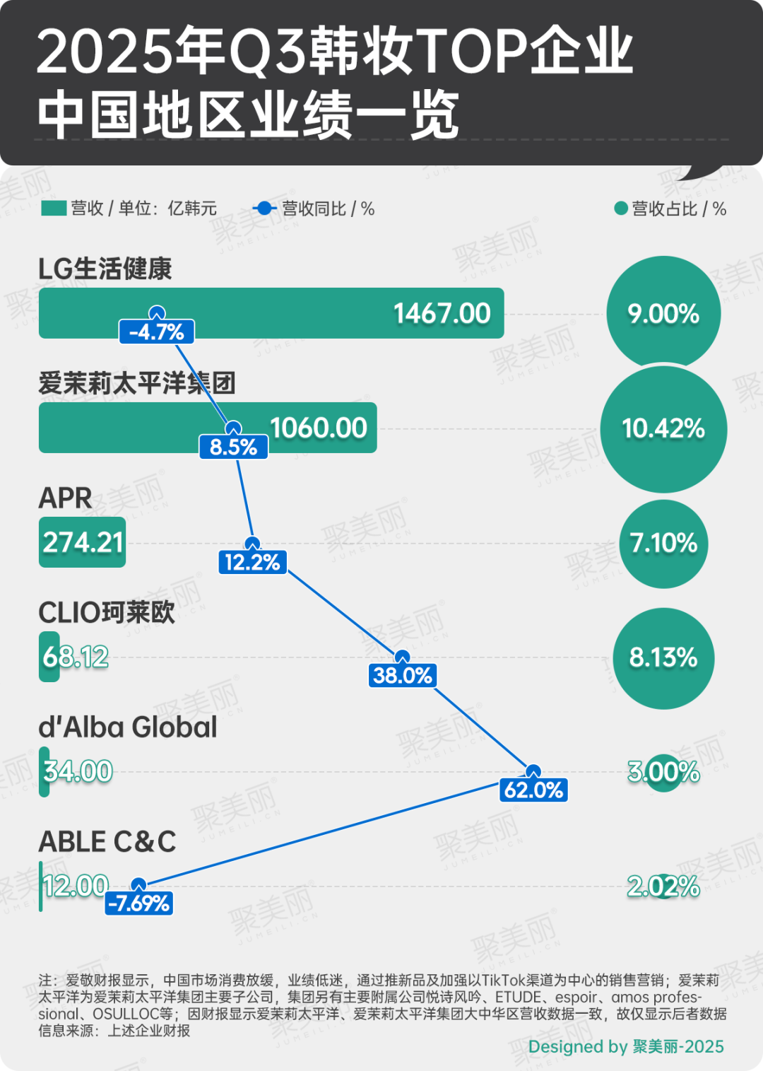 聚焦在華境況,下圖6家韓妝TOP企業(yè)中4家在中國地區(qū)Q3營收同比呈增長,更有CLIO珂萊歐在中國地區(qū)營收同比大漲38%,新銳韓妝d'Alba Global暴漲62%,愛茉莉太平洋集團(tuán)增長8.5%并且其營收占比已超10.4%,業(yè)績呈現(xiàn)出正反饋。