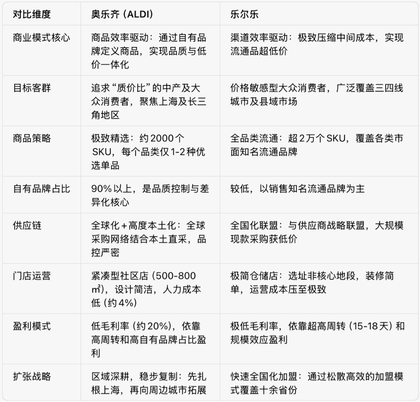 我們認(rèn)為,ALDI和樂爾樂代表了硬折扣的兩條成功路徑,ALDI是商品驅(qū)動型,核心是“造貨”,通過重新定義商品來實現(xiàn)低價高質(zhì)。樂爾樂是渠道驅(qū)動型,核心是“賣貨”,通過重塑流通效率來降低已知商品的售價,它更像一個超級分銷商,實際上是披著零售外衣的B2B平臺,創(chuàng)造出了中國特色的硬折扣模式。
