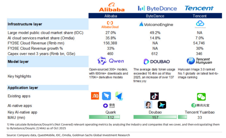 根據(jù)高盛最新的中國互聯(lián)網分析報告,阿里在企業(yè)端外部AI云的收入規(guī)模上領先,市占率達到35.8%,字節(jié)跳動為14.8%,騰訊為7%。