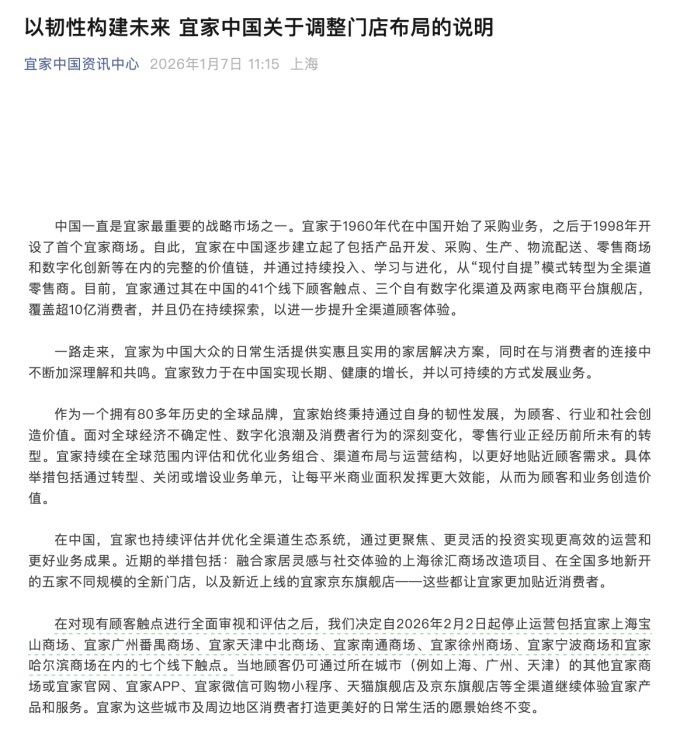 聯(lián)商快訊:1月7日,宜家發(fā)布了《宜家中國關(guān)于調(diào)整門店布局的說明》,決定自2026年2月2日起停止運營包括宜家上海寶山商場、宜家廣州番禺商場、宜家天津中北商場、宜家南通商場、宜家徐州商場、宜家寧波商場和宜家哈爾濱商場在內(nèi)的七個線下門店。