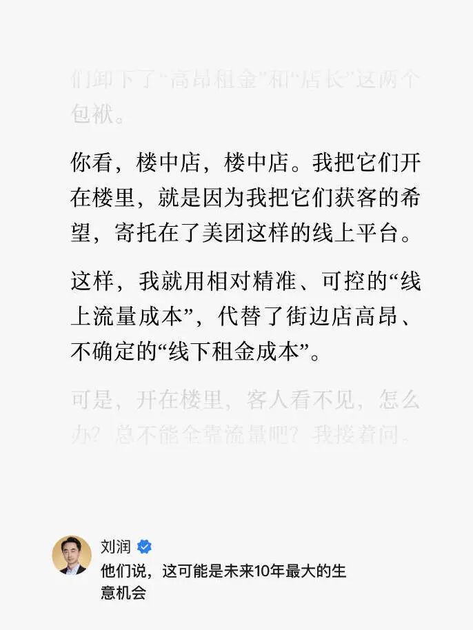 30 分鐘達(dá)的即時零售,正在改變消費者對“方便”的預(yù)期。而美團(tuán)正在對服務(wù)類業(yè)態(tài)商戶力推的“樓中店”(在公寓樓、寫字樓里開店,可以拿到更優(yōu)惠的租金,由美團(tuán)解決流量入口問題),則將對購物中心的到場消費造成新一輪沖擊。