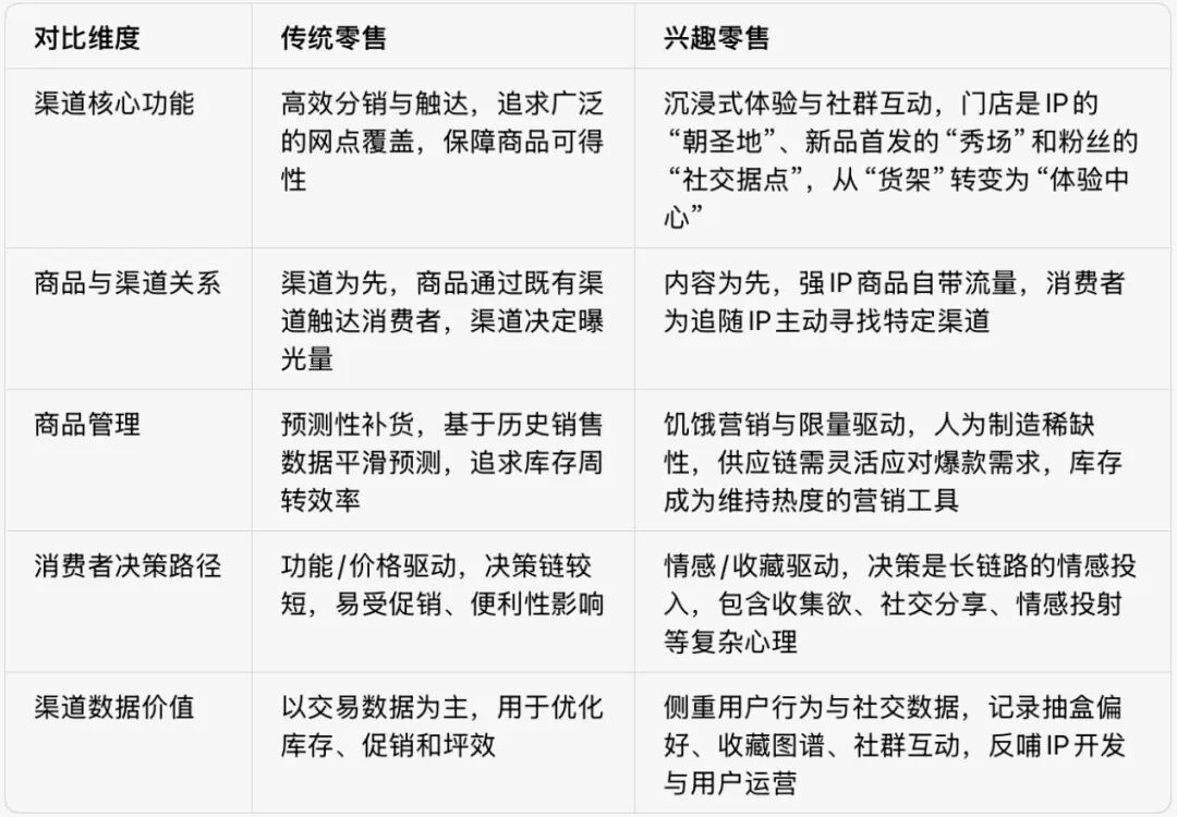 由此可見,我們不能用傳統(tǒng)零售的邏輯來(lái)解讀興趣零售。從渠道運(yùn)營(yíng)的本質(zhì)來(lái)看,兩者存在根本性差異:傳統(tǒng)零售的核心是“渠道驅(qū)動(dòng)銷售”,而興趣零售則是“內(nèi)容驅(qū)動(dòng)渠道”,其渠道不再是簡(jiǎn)單的商品流通管道,而是“IP體驗(yàn)的延伸觸點(diǎn)”。