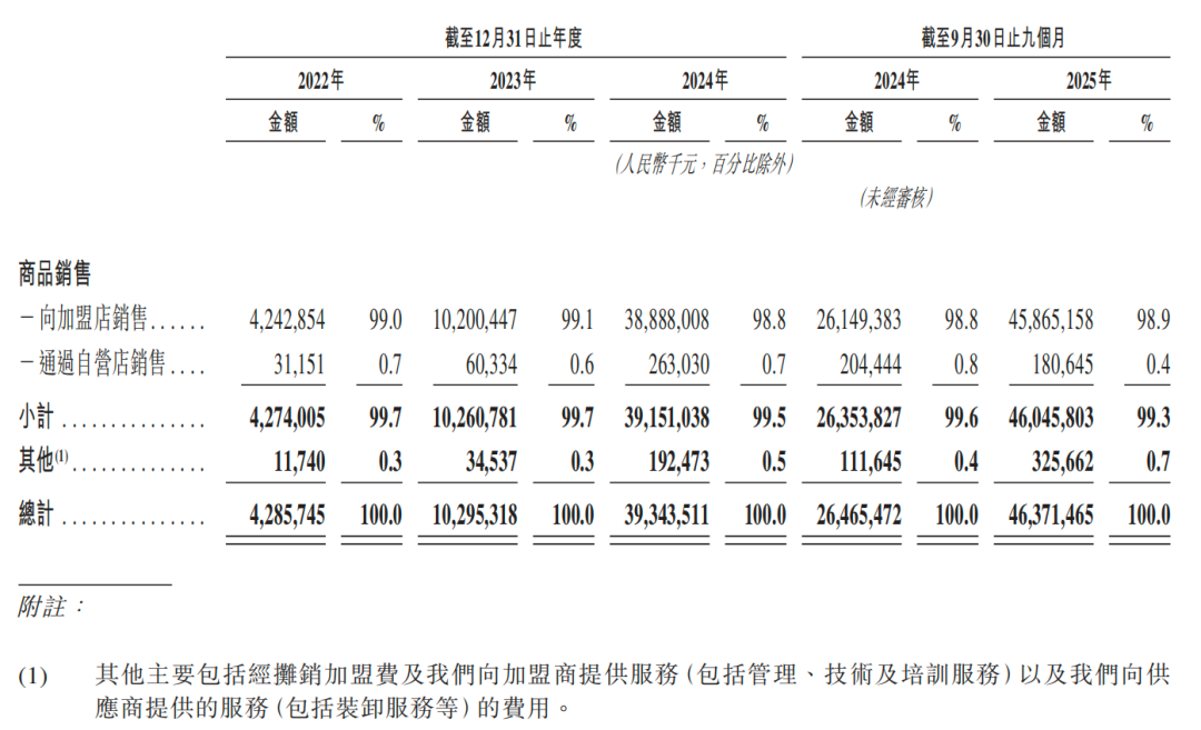 以龍頭企業(yè)鳴鳴很忙集團(tuán)為例,2024年集團(tuán)營(yíng)業(yè)收入393.44億元,其中商品銷售收入391.51億元(占比99.5%),加盟費(fèi)及服務(wù)費(fèi)僅1.92億元(占比0.5%)。其毛利率從2022年的7.5%穩(wěn)步提升至2025年前三季度的9.7%,經(jīng)調(diào)整凈利率從1.9%提高至3.9%,盈利能力與盈利質(zhì)量同步提升。