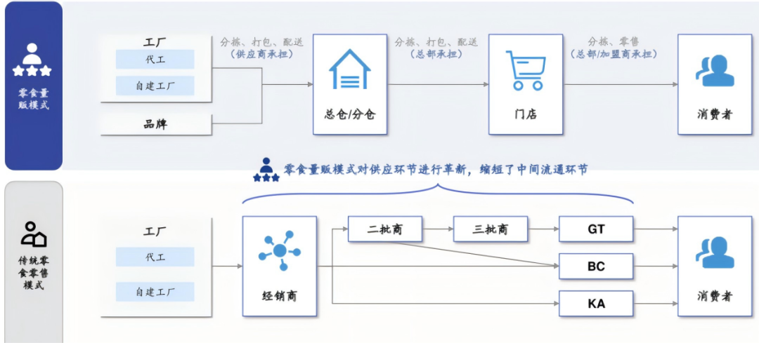 量販模式是專賣店渠道中一種創(chuàng)新的商業(yè)模式,專注于提供精選多品牌、多品類的產(chǎn)品組合,為消費(fèi)者提供了更具成本效益、更便捷的購(gòu)物體驗(yàn),成為休閑食品飲料零售行業(yè)擴(kuò)張的重要力量。量販零食店精準(zhǔn)抓住了傳統(tǒng)超市渠道的上述痛點(diǎn),進(jìn)行了一場(chǎng)針對(duì)性的渠道革命,對(duì)“價(jià)—品—場(chǎng)”進(jìn)行了全面重構(gòu)。