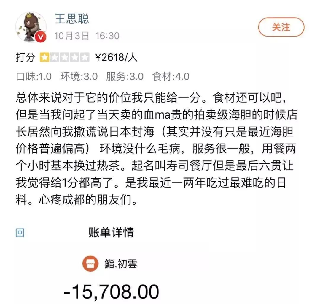 見慣了世面的王思聰,曾兩次大戰(zhàn)高端日料店,在人民群眾之間獲得一片共鳴。一次是在成都花了一萬五給出一星差評,另一次是怒斥上海日料店臨時加價、態(tài)度傲慢。