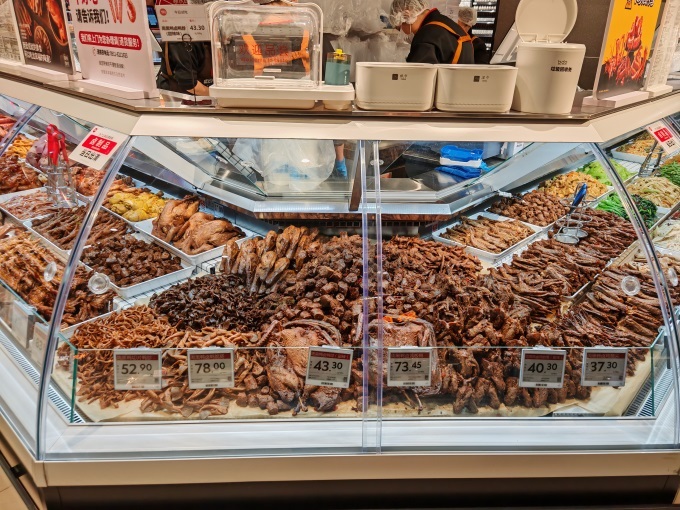 熟食與餐飲化體驗(yàn)是本次調(diào)改的一大亮點(diǎn)。門店聘請(qǐng)專業(yè)廚師團(tuán)隊(duì),著力打造豐富的“餐桌商品”系列。從熱鍋系列的龍蝦尾、蒲燒鰻魚,到現(xiàn)場(chǎng)制作的涼拌葷菜、川味拌菜、撈汁海鮮及下酒菜,選擇多樣。同時(shí),深度結(jié)合本地飲食文化,引入競(jìng)品市場(chǎng)傳統(tǒng)大單品臘牛肉、醬牛肉,并與本地知名醬鹵品牌“豆記熟食”合作。烘焙區(qū)主打健康與質(zhì)價(jià)比,半斤榴蓮肉榴蓮千層、核桃滿滿歐包,以及內(nèi)含25顆新鮮草莓的奶油盒子蛋糕等爆品,成為治愈系甜食愛好者的新寵。