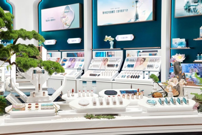據(jù)悉,花西子門店位于杭州城西銀泰百貨一層時尚名品專區(qū)。步入店內(nèi),軒窗、琉璃、水墨山影等元素撲面而來,巧妙融入園林造景意境,中心柜臺以三潭印月城市元素為點綴,打造出一個兼具東方園林韻味與現(xiàn)代風尚的美妝零售空間。