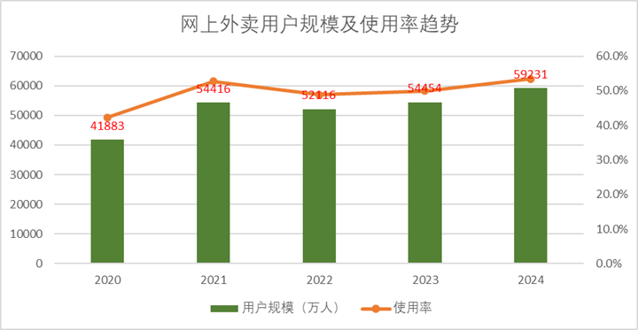 圖:網(wǎng)上外賣用戶規(guī)模及使用率趨勢,來源:中商情報(bào)網(wǎng)