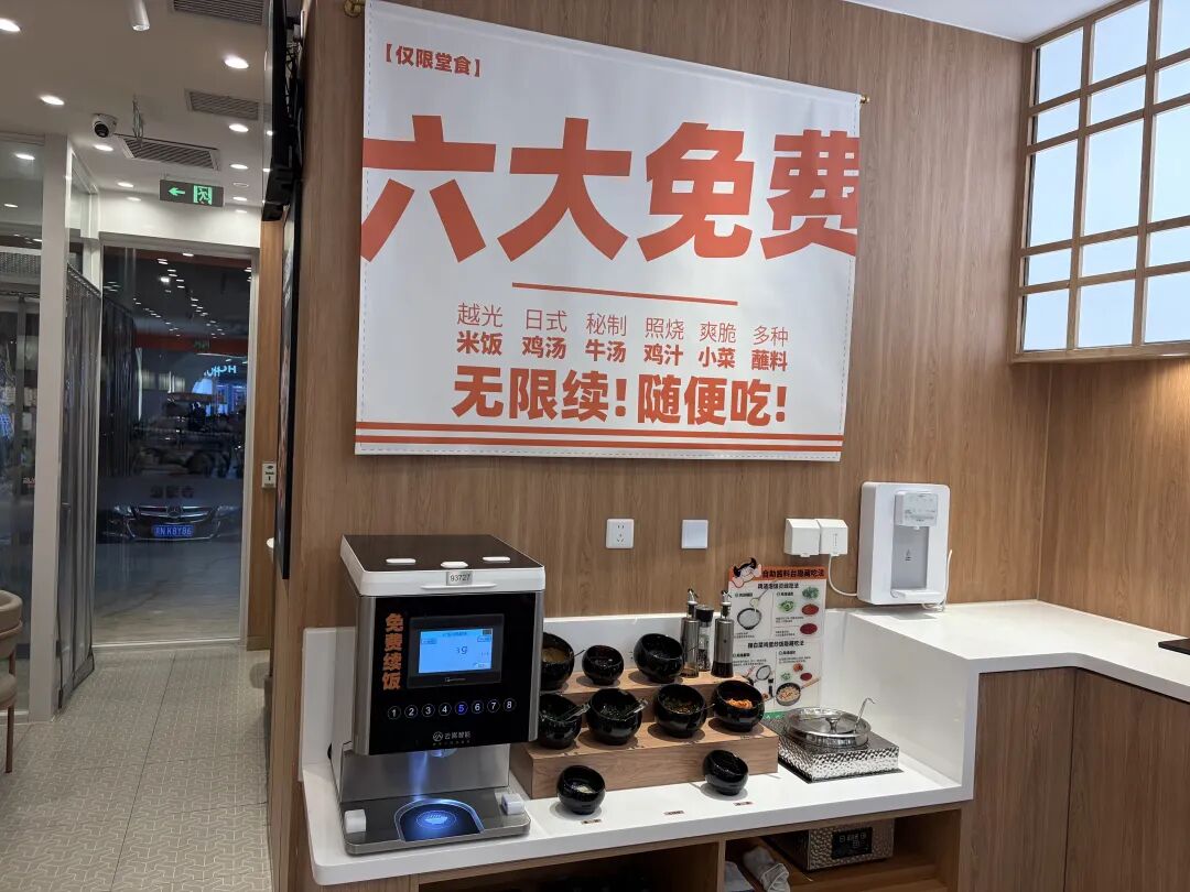 新店型推出堂食六大免費,上線自助臺,包括越光米飯、日式雞湯、秘制牛湯、照燒雞汁、爽脆小菜、多種蘸料免費。