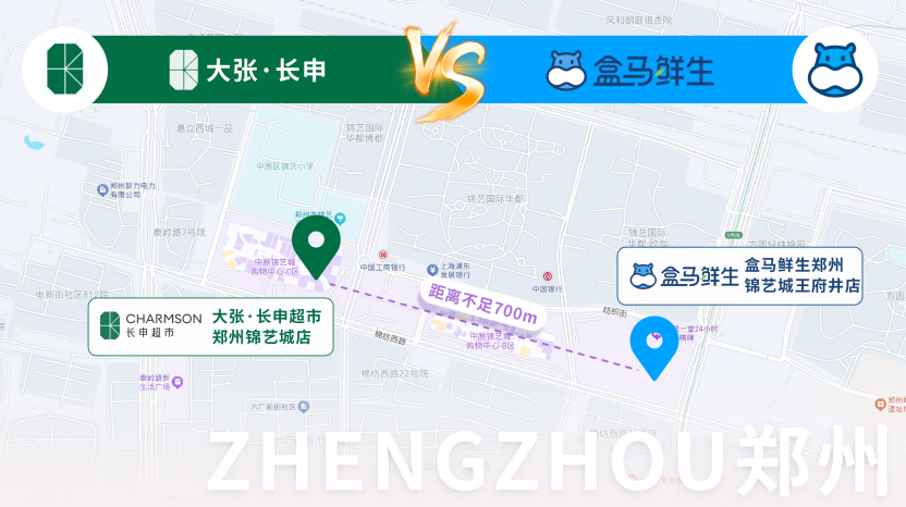 事實(shí)上,早在2025年5月,大張便已官宣將在鄭州錦藝城布局長申超市門店。值得關(guān)注的是,該店與同在錦藝城的盒馬門店直線距離僅700米,這般超近距離的“貼身肉搏”,在中國零售商業(yè)史上頗為少見。