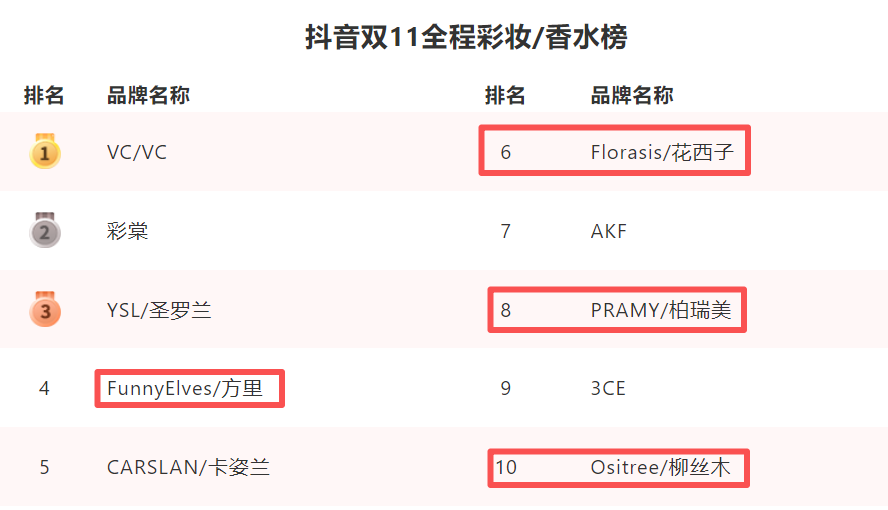 2023年,抖音雙11曾單獨開設“彩妝香水榜”,TOP 10中新銳國貨品牌一度占據(jù)4席,花西子、彩棠、方里、柳絲木等均位列其中。但2024-2025年,平臺將彩妝與護膚合并為“美妝”統(tǒng)計時,這些品牌便集體從總榜上消失了。