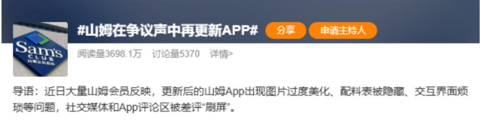 最出圈的事件,則是在2025年10月底,一位阿里高管空降山姆,隨后山姆的APP出現(xiàn)了一個變化:白底實物圖換成了精修成品圖,甚至是疑似AI生成圖,還有一些生鮮商品直接使用烹飪后的成品樣圖。產品參數(shù)信息也被精修圖頂?shù)搅隧撁嫦路,要查看需要多滑動幾次。這一事件引發(fā)了巨大的輿論爭議,并登上熱搜。