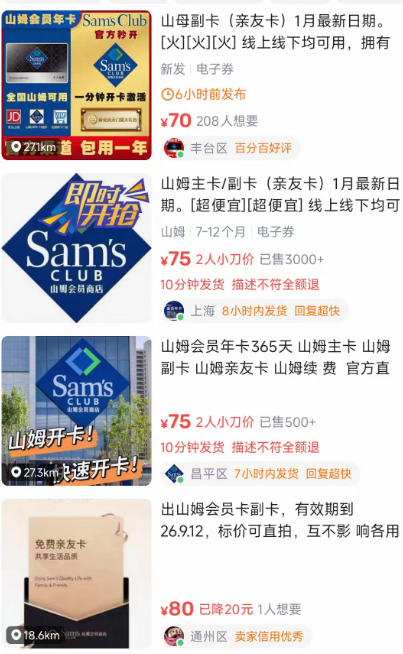 中產不好找,但山姆找到了非中產。打開閑魚,能夠輕松搜到七八十元的山姆副卡,低廉的價格讓月光的打工人、縣城多娃家庭的寶媽、想試吃的大學生也能輕松下手。副卡人數(shù)并不低,畢竟每位山姆會員都能開一張副卡,在社交媒體上更是有能夠開四張副卡的例子。