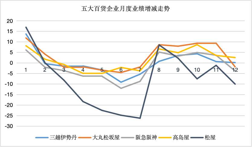 主要企業(yè)比較,松屋受到的影響幅度最大,高島屋波動(dòng)幅度最小、運(yùn)營(yíng)最穩(wěn)定。阪急阪神因?yàn)橛汹婕笨偟暾谶M(jìn)行商裝調(diào)改,影響較大。三越伊勢(shì)丹雖然強(qiáng)化國(guó)內(nèi)會(huì)員和海外會(huì)員營(yíng)銷、低效益部分下降因素,但是對(duì)全年還是有較大影響。