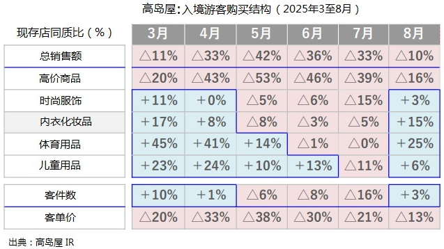 1)主要看點(diǎn):一是海外游客消費(fèi)崩了,雖然游客數(shù)量持續(xù)增加,來源分布也愈加廣泛,但是客單價(jià)顯著下降。最大原因是匯率變化,2024年4至7月美元與日元比值達(dá)到157至161日元(約合人民幣6.9元-7元),引發(fā)高價(jià)商品業(yè)績(jī)暴漲,2025年貶值優(yōu)勢(shì)消失,形成同比消極反饋。二是很多國(guó)際高價(jià)品漲價(jià),影響消費(fèi)購(gòu)買愿望;三是購(gòu)物欲望較強(qiáng)的游客群體受各種因素影響,總數(shù)及購(gòu)買客數(shù)不穩(wěn)、客單價(jià)大幅下降,導(dǎo)致總體購(gòu)買力跌落。