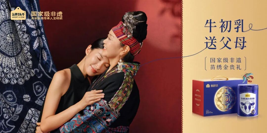 認(rèn)養(yǎng)一頭牛在2024年聯(lián)名紫禁文創(chuàng)推出的“初乳御品”禮盒以及去年綁定“中秋團(tuán)圓”場(chǎng)景推出貴州苗繡聯(lián)名禮盒,就是這一邏輯的體現(xiàn)。
