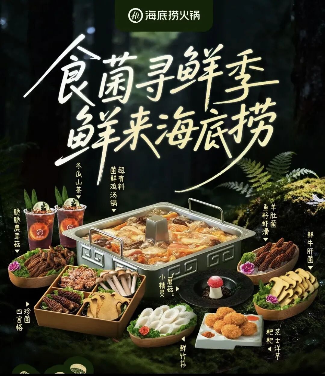 店內(nèi)的墻面、餐桌立牌也隨處可見“食菌尋鮮記,鮮來海底撈”的宣傳標語。