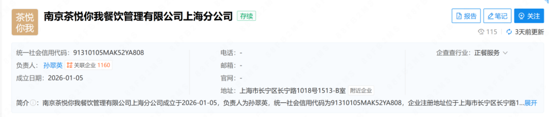 另據(jù)天眼查,1月5日,南京茶悅你我餐飲管理有限公司(下稱“南京茶悅”)在上海成立分公司,經(jīng)營范圍涉及餐飲服務(wù)、食品互聯(lián)網(wǎng)銷售、食品銷售、餐飲管理、企業(yè)總部管理等。南京茶悅成立于2022年,由茶顏悅色母公司——湖南茶悅文化產(chǎn)業(yè)發(fā)展集團(tuán)有限公司全資持股,同年,茶顏悅色在南京開出門店,首次進(jìn)入江浙滬市場。