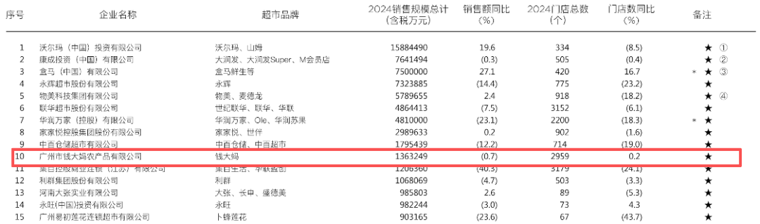 2025年中,中國(guó)連鎖協(xié)會(huì)曾經(jīng)發(fā)布過中國(guó)商超的排名,錢大媽的銷售額排到了第10位,超過了永旺、卜蜂蓮花等眾多耳熟能詳?shù)睦吓粕坛,排在錢大媽前面的分別是沃爾瑪(沃爾瑪、山姆)、康成投資(大潤(rùn)發(fā))、盒馬、物美、華潤(rùn)萬家等。