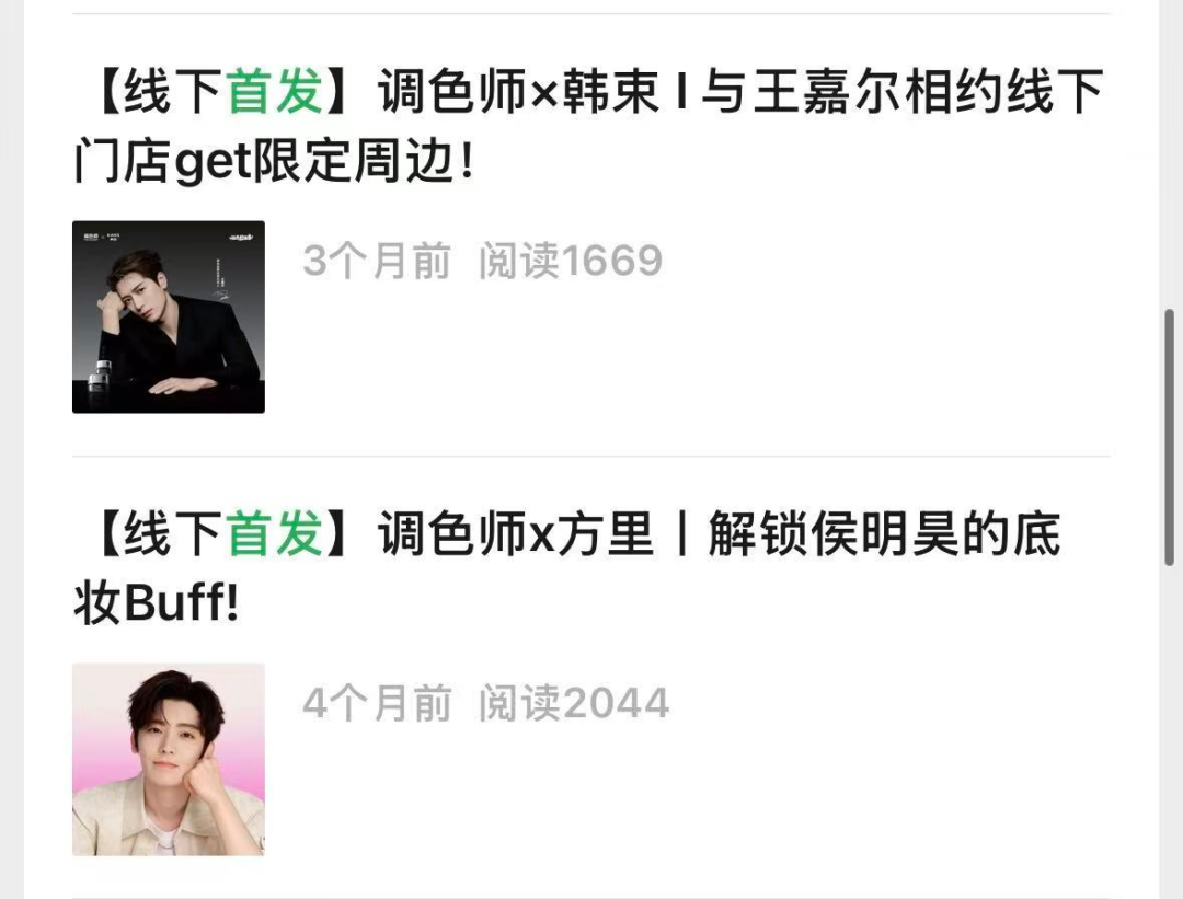 而為了“擊中”這些消費者,調(diào)色師最常用的營銷手段就是和國產(chǎn)美妝品牌的代言人發(fā)起線下聯(lián)動,用代言人的周邊來促進銷售。大量可復制的成功經(jīng)驗和更為親民的形象也讓其后續(xù)的風險更小。