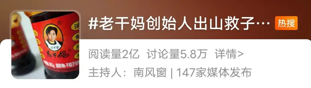 就在昨天, #老干媽創(chuàng)始人出山救子又賺翻了 引發(fā)熱議,登上微博熱搜。