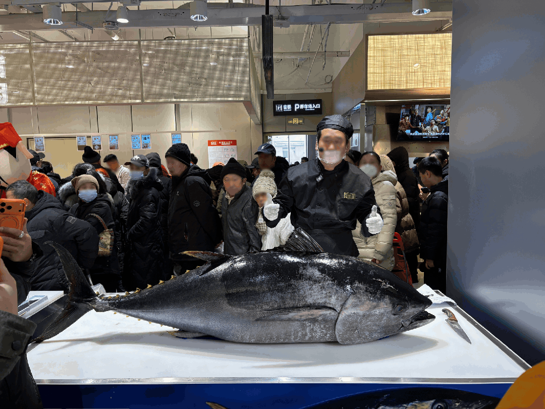 三文魚(yú)也有更大規(guī)模的陳列展示。開(kāi)業(yè)活動(dòng)期間,門(mén)店還組織了藍(lán)鰭金槍魚(yú)開(kāi)魚(yú)秀活動(dòng)。
