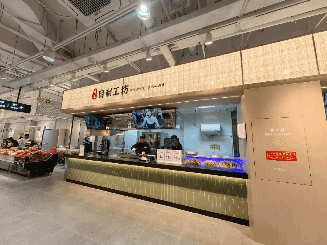 首先是自營(yíng)項(xiàng)目,有“食光驛站”“手作食鋪”和“自制工坊”,包含的烤羊肉串、烤牛肉干及肇東小餅等,透過(guò)玻璃,顧客不僅可以看見(jiàn)原料,還可以清晰地看到員工分割、腌肉、切丁、串串及燒烤,讓顧客能清晰感受到加工過(guò)程。