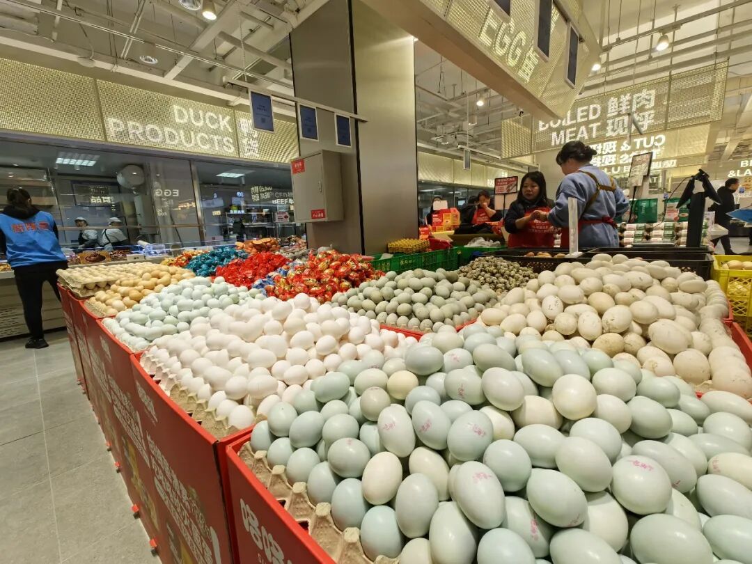 在新隆嘉,蛋品也被歸集在蔬菜這一場(chǎng)景中。各種蛋品集中陳列,品種豐富的同時(shí),也更容易營(yíng)造銷(xiāo)售勢(shì)能,專(zhuān)人推動(dòng)也有利于提高銷(xiāo)售效率。