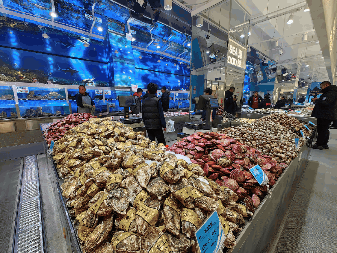 品種上基本做全了水產(chǎn)的主流品項(xiàng)。包括各種高檔海鮮,如帝王蟹、毛蟹、面包蟹等也有了平價(jià)售賣(mài)的感覺(jué);各種凍品、貝類(lèi)、冰鮮貨滿堆山;還有鮮活魚(yú)蝦蟹,全面強(qiáng)調(diào)只賣(mài)水產(chǎn)不賣(mài)水;此外,海鮮區(qū)還提供加工服務(wù),免費(fèi)蒸煮,其他加工項(xiàng)收取10%的加工費(fèi),從而更加方便顧客消費(fèi)。
