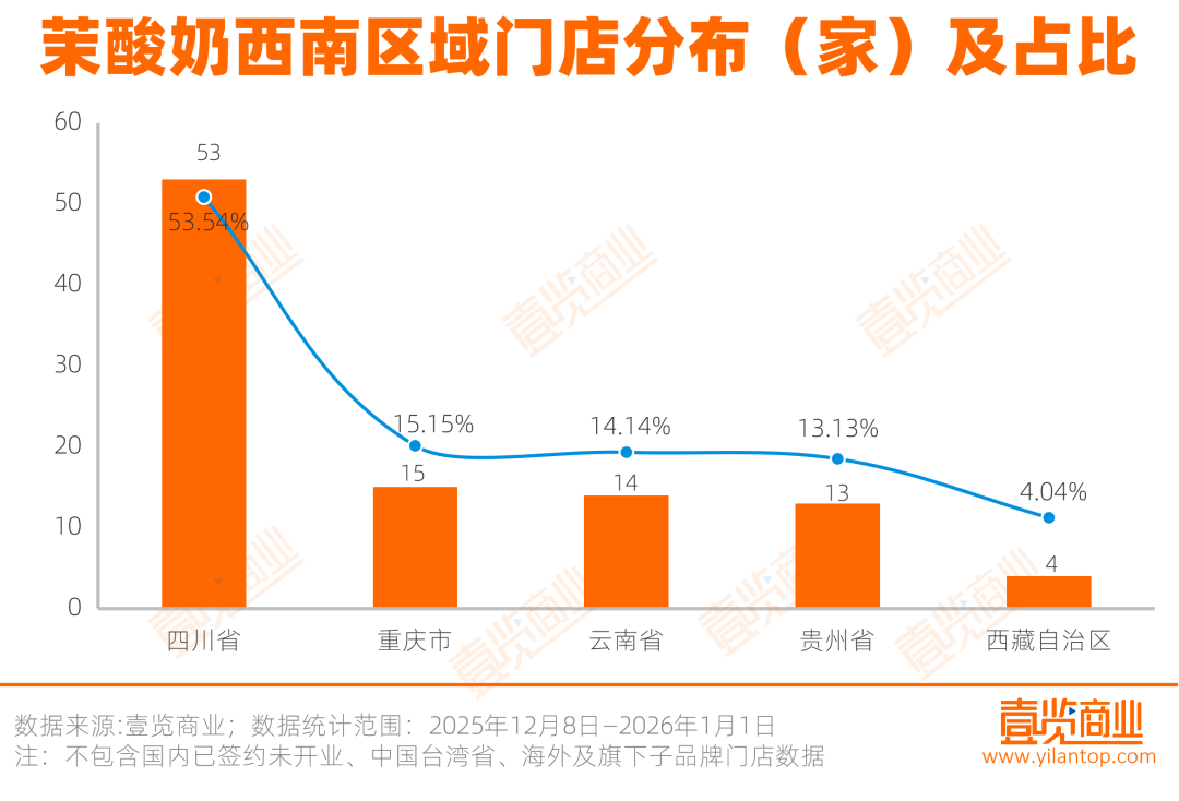 在西南區(qū)域,四川省以53家門店占據(jù)了半壁江山,重慶市、云南省、貴州省規(guī)模相當(dāng),西藏自治區(qū)僅有4家門店。