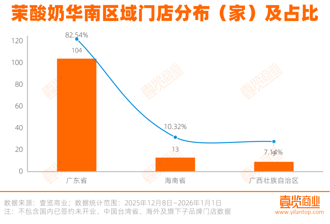 在華南區(qū)域,茉酸奶門店則極度依賴廣東省,海南省和廣西壯族自治區(qū)門店數(shù)合計(jì)不到廣東省門店數(shù)的四分之一。