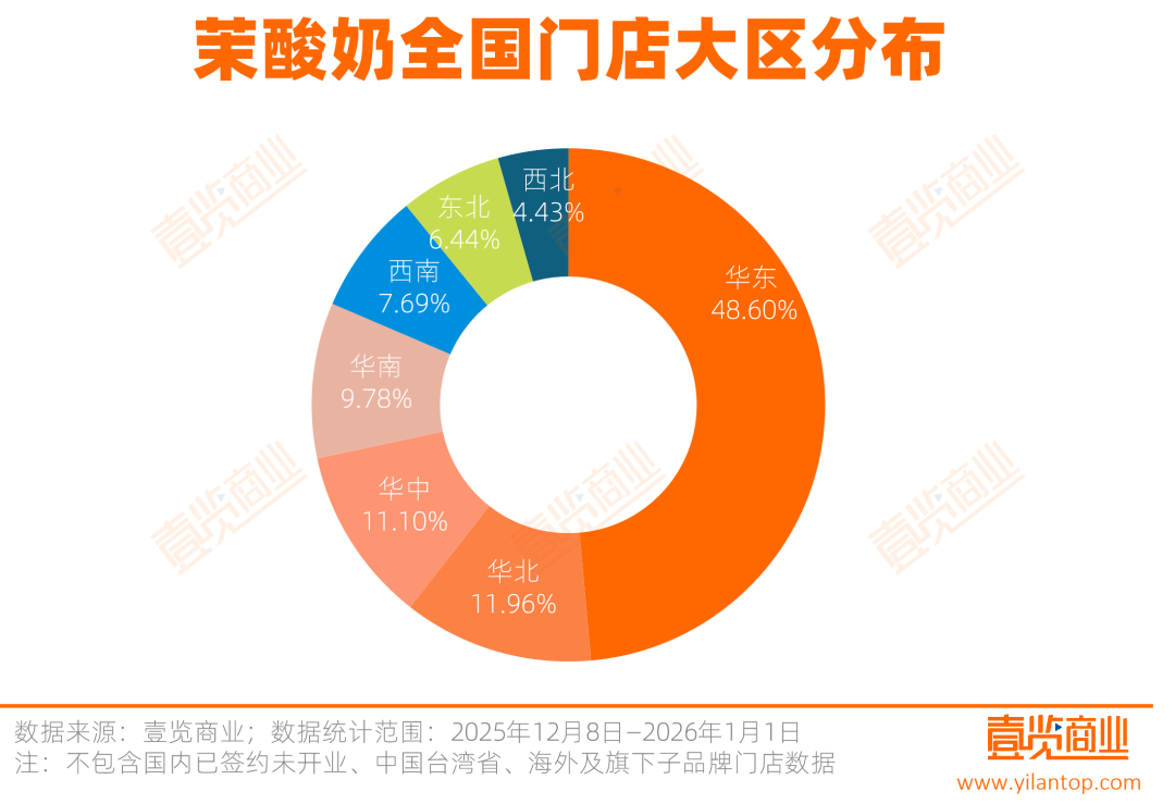 從全國(guó)布局來看,茉酸奶高度集中在華東。華東地區(qū)以626家門店,占比48.60%,占據(jù)了茉酸奶全國(guó)近一半的現(xiàn)存門店數(shù)量。而華北、華中、華南三個(gè)大區(qū)共有403家門店,合計(jì)占比32.78%,是重要的區(qū)域支撐。與之相比,西南、東北、西北三大區(qū)域門店總數(shù)占比不足兩成,市場(chǎng)滲透率都還很低。