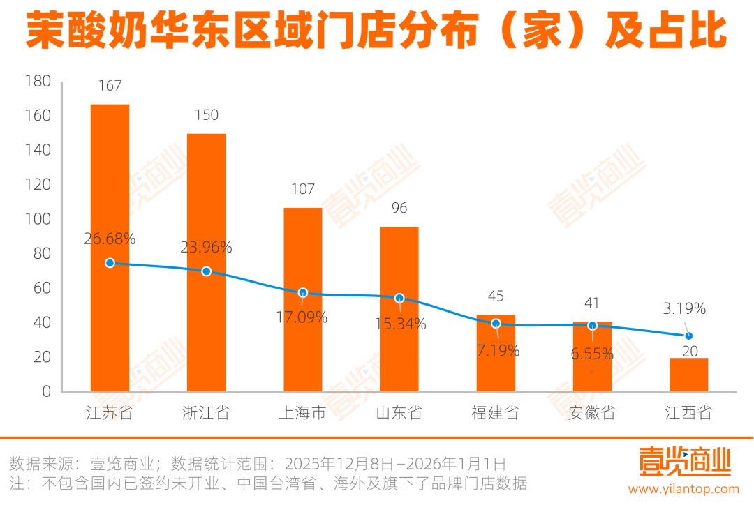 在華東內(nèi)部,江蘇省和浙江省為品牌貢獻(xiàn)了半數(shù)以上的門店;而作為直轄市的上海市,門店數(shù)高達(dá)17.09%居于第三;安徽、福建門店數(shù)剛過40家,占比合計(jì)超過13%;江西省的17家門店是區(qū)域內(nèi)占比最少的,僅3.19%。