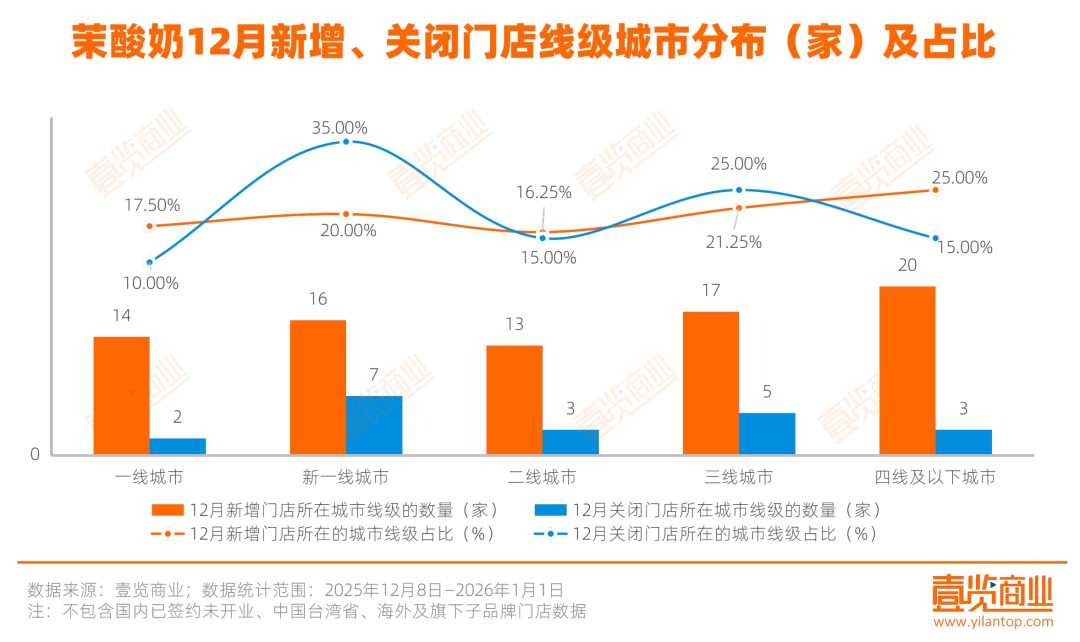從城市線級(jí)來看,新增門店分布較為均衡。新增最多的是三線及以下城市,共新增37家,占比25%,說明品牌正在積極探索向下沉市場(chǎng)滲透。三線城市的17家新增門店占比21.25%,與四線及以下城市共同構(gòu)成了12月近一半的新增數(shù)量。新一線與二線城市的新增門店合計(jì)占比37.5%,二線城市新增最少,僅貢獻(xiàn)16.25%的新增占比。