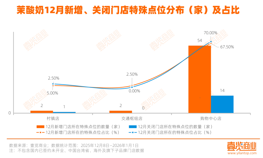 從特殊點(diǎn)位來看,12月門店調(diào)整的重心集中在購(gòu)物中心,70.00%的新增門店集中在此,而閉店門店也有67.50%。說明品牌可能在用新開的優(yōu)質(zhì)點(diǎn)位,逐步替換掉盈利與運(yùn)營(yíng)效率較低的門店,從而提升整體盈運(yùn)能力。