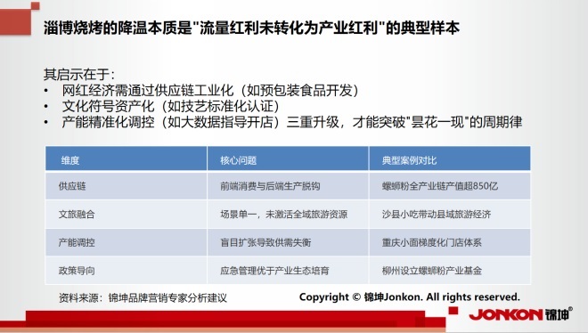 錦坤品牌專家認(rèn)為,淄博爆火是民間熱度與政府服務(wù)共振的結(jié)果,打響了城市品牌,但產(chǎn)業(yè)基礎(chǔ)弱、可持續(xù)性不足,需向產(chǎn)業(yè)鏈化、業(yè)態(tài)多元化升級(jí)才能長(zhǎng)效發(fā)展。