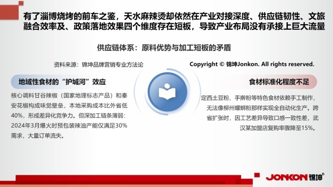 但不足明顯,燒烤上游供應(yīng)鏈分散,缺規(guī);a(chǎn)業(yè)鏈,產(chǎn)品同質(zhì)化,且依賴單一IP,無多元業(yè)態(tài)承接,半年后熱度回落。
