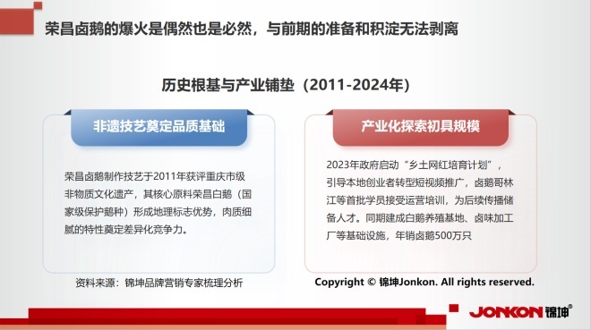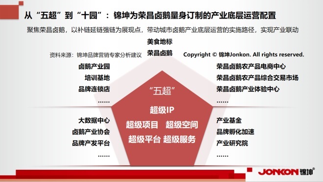 錦坤品牌專家應(yīng)邀赴榮昌實(shí)地調(diào)研并與時(shí)任榮昌區(qū)委書記高洪波等黨政主要領(lǐng)導(dǎo)班子專題研討時(shí)建議以“五超”(超級(jí)項(xiàng)目、超級(jí)空間、超級(jí)服務(wù)、超級(jí)平臺(tái)和超級(jí)IP)助力產(chǎn)業(yè)落地,延長(zhǎng)產(chǎn)業(yè)鏈,培育頭部品牌,深化“鹵鵝+非遺+文旅”融合,以“六新”(新人群、新品類、新場(chǎng)景、新業(yè)態(tài)、新模式、新渠道)推動(dòng)產(chǎn)業(yè)走出去,才能真正實(shí)現(xiàn)從“縣域特色”到“全國(guó)知名”的跨越。