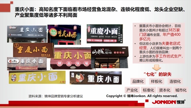 在經(jīng)過與重慶市、大渡口區(qū)兩級(jí)政府以及相關(guān)委辦局、本地規(guī)上企業(yè)和外地頭部企業(yè)、相關(guān)消費(fèi)者以及各類合作商、渠道商和服務(wù)商的大量調(diào)研、研究論證和座談分析后,錦坤品牌專家為重慶小面量身訂制了千億IP品牌萬億產(chǎn)業(yè)平臺(tái)的“八個(gè)一”的品牌頂層設(shè)計(jì)和產(chǎn)業(yè)底層運(yùn)營(yíng),“六方”(政產(chǎn)商智媒資)合力、“七化”(品牌化、樣板化、連鎖化、產(chǎn)業(yè)化、標(biāo)準(zhǔn)化、資本化和城市化)運(yùn)作和“八產(chǎn)”(文旅農(nóng)食餐零金科)聯(lián)動(dòng),在重慶市委市政府的高度重視和大渡口區(qū)委區(qū)政府的全面推動(dòng)下,成為推動(dòng)重慶市名片引爆和大渡口產(chǎn)業(yè)打造的超級(jí)新引擎,已在全國(guó)全球范圍內(nèi)擁有30多萬家小店的重慶小面,正向千億營(yíng)收萬億產(chǎn)業(yè)發(fā)起沖擊!