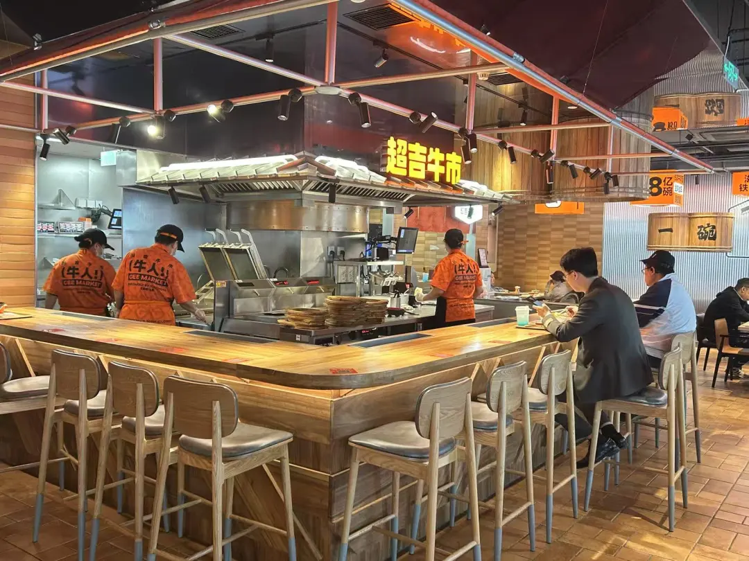 去年年初,吉野家在北京開了家名為“吉野家·超吉牛市”的主題店,這家店首次打破了吉野家依靠后廚標準化出餐的傳統(tǒng)模式,將半封閉廚房改為明檔廚房,并在廚房的外圍設(shè)置了U型吧臺,主打現(xiàn)點現(xiàn)做的鐵板菜。