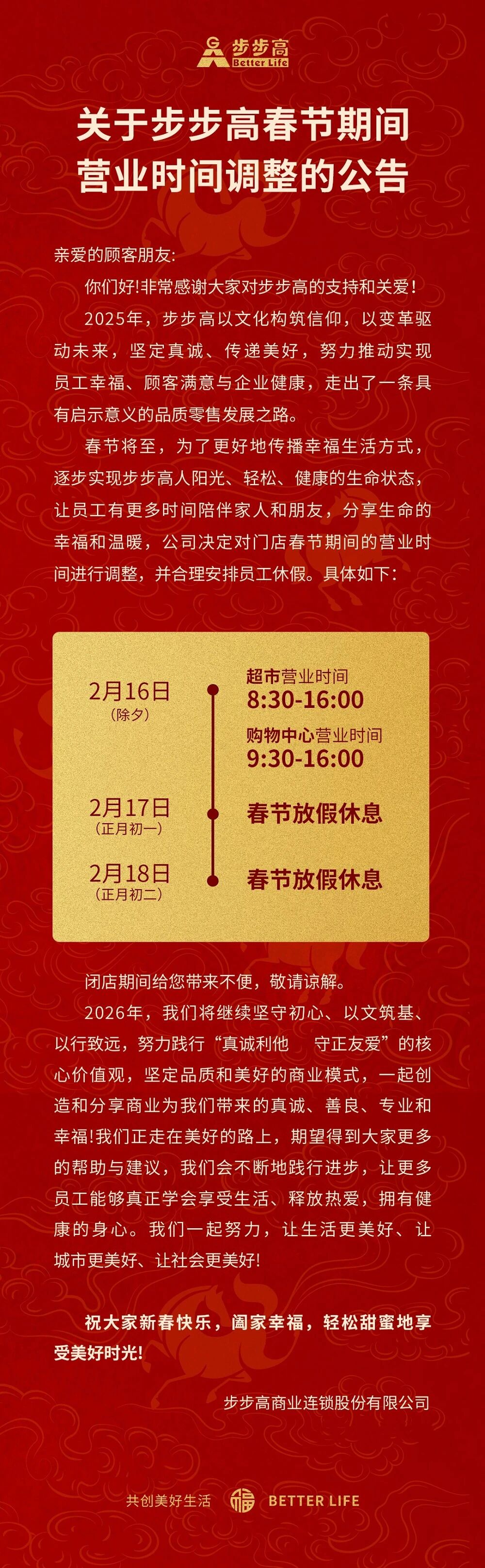 步步高首次調整春節(jié)營業(yè)時間,除夕提早打烊,初一至初二全休。