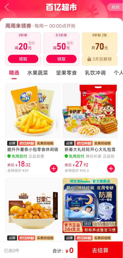 由于下設(shè)在百億補貼頻道之下,百億超市也提供了各類品優(yōu)惠券及補貼活動,比如“周周領(lǐng)券”活動,即每周一00:00準時開搶優(yōu)惠券,包含8折券、8.5折券等福利。
